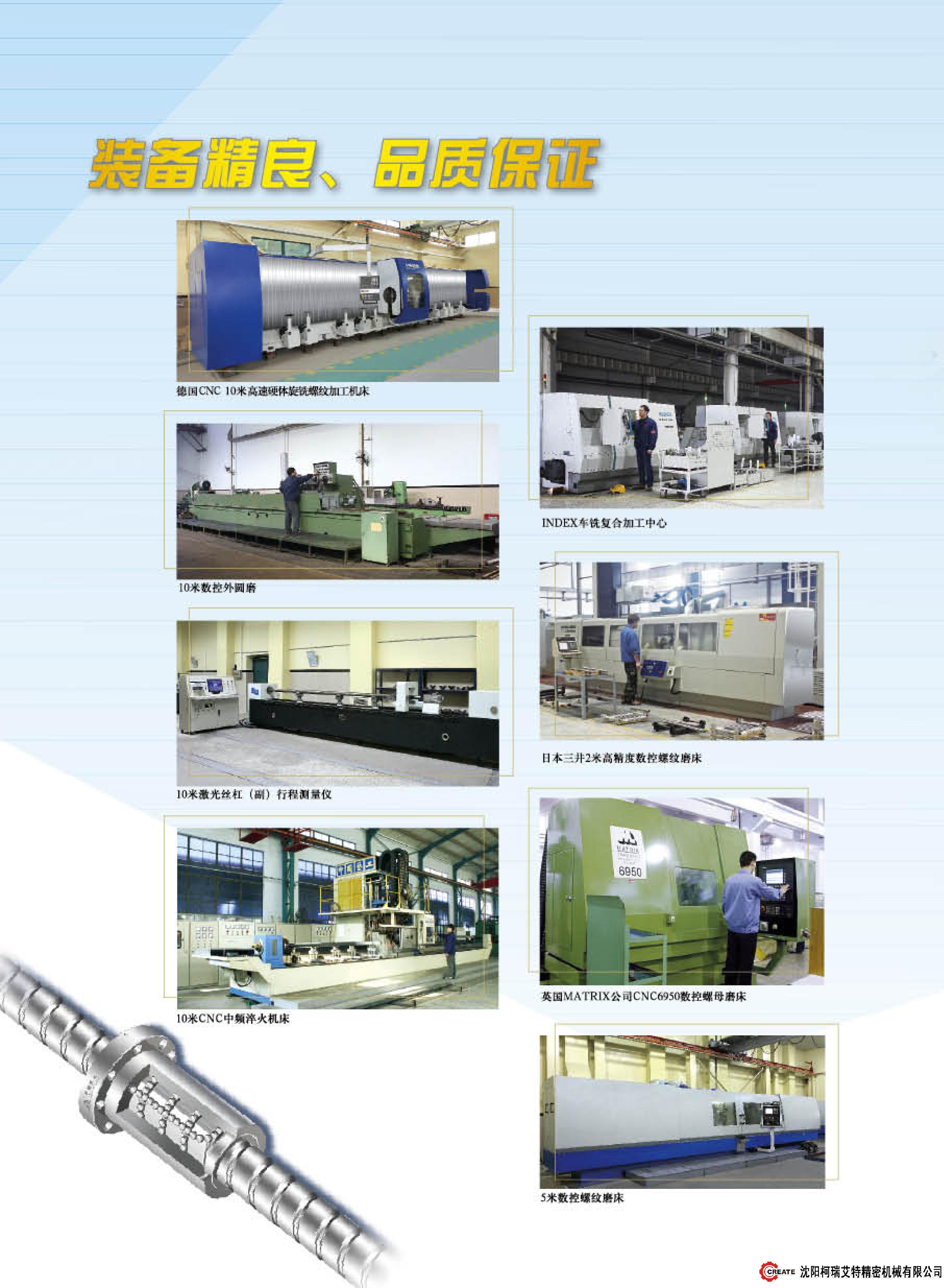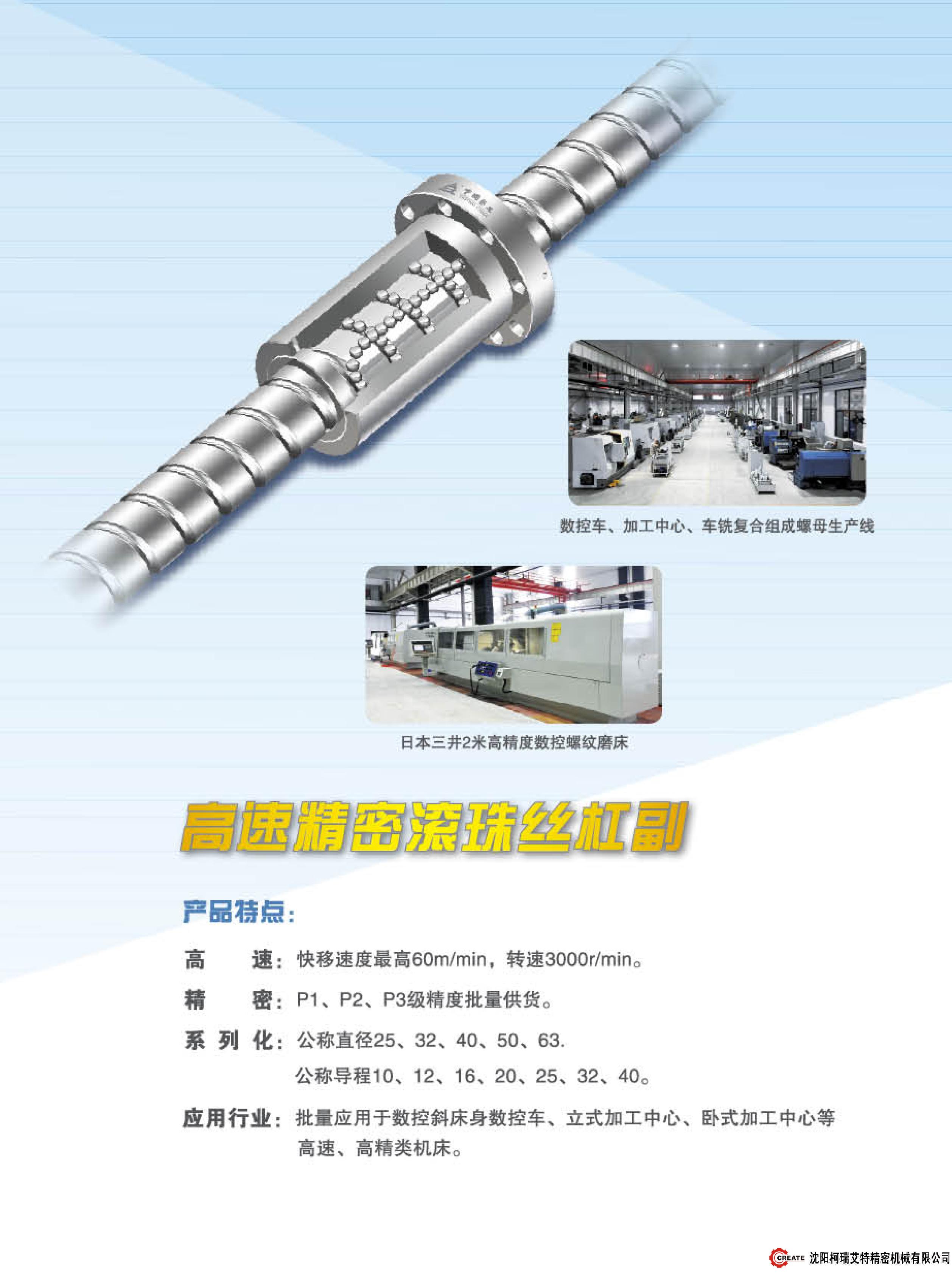 公司建有滾動功能部件全性能試驗室,高速滾珠絲杠副60m/min運行時噪音70dB,高速滾動直線導軌副60m/min運行時噪音68dB,為精密臥式加工中心批量配套滾珠絲杠副、滾動導軌副,實現(xiàn)各軸快移速度40m/min、定位精度0.002mm、重復定位精度0.001mm。公司構筑了完備的設備保障體系,建成了高精度滾珠絲杠副、大型滾珠絲杠副、滾動導軌副生產(chǎn)線。公司產(chǎn)品為高速、高精中高檔數(shù)控機床大批量配套,推進了國產(chǎn)滾動功能部件的提檔升級和替代進口。